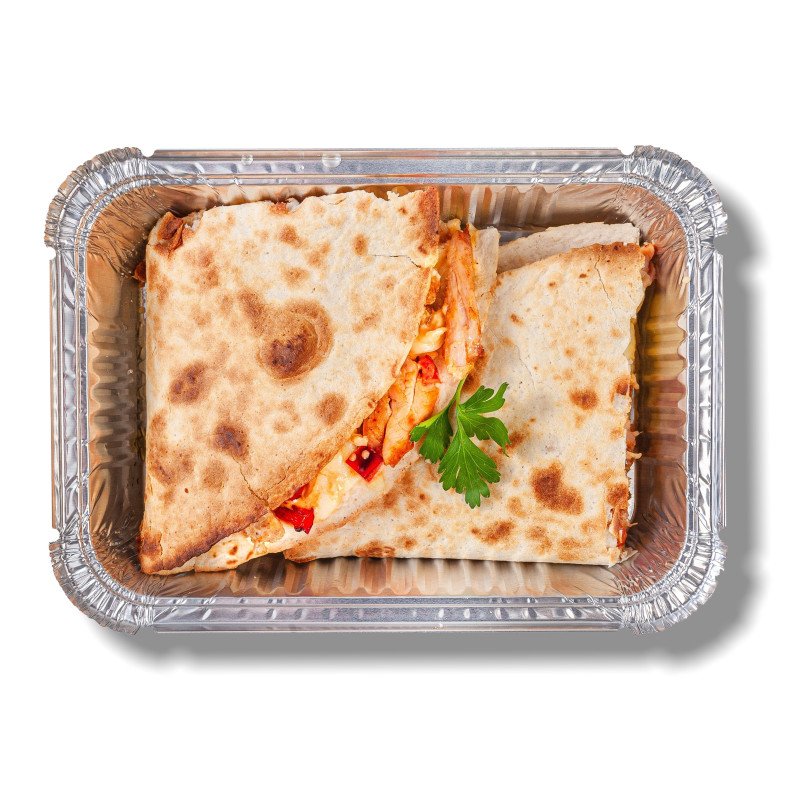 Классическая кесадилья в нашем исполнении. Запеченная тортилья с начинкой из рубленого шашлыка и обжаренных овощей на сливочно-томатной основе с добавлением сыров сулугуни и моцарелла.