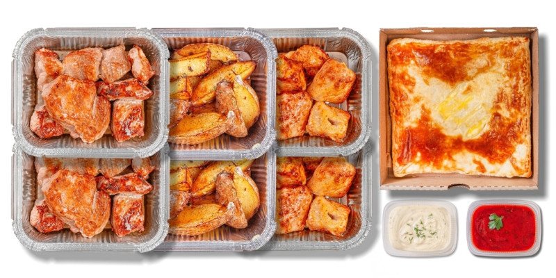 В составе набора : Свиная шея - 2 порции / 460 гр Филе куриной грудки - 2 порции / 460 гр Картошечка по-деревенски - 2 порции / 400 гр Хачапури Пеновани - 1 шт Соус шашлычный - 100 гр Соус фирменный - 100 гр